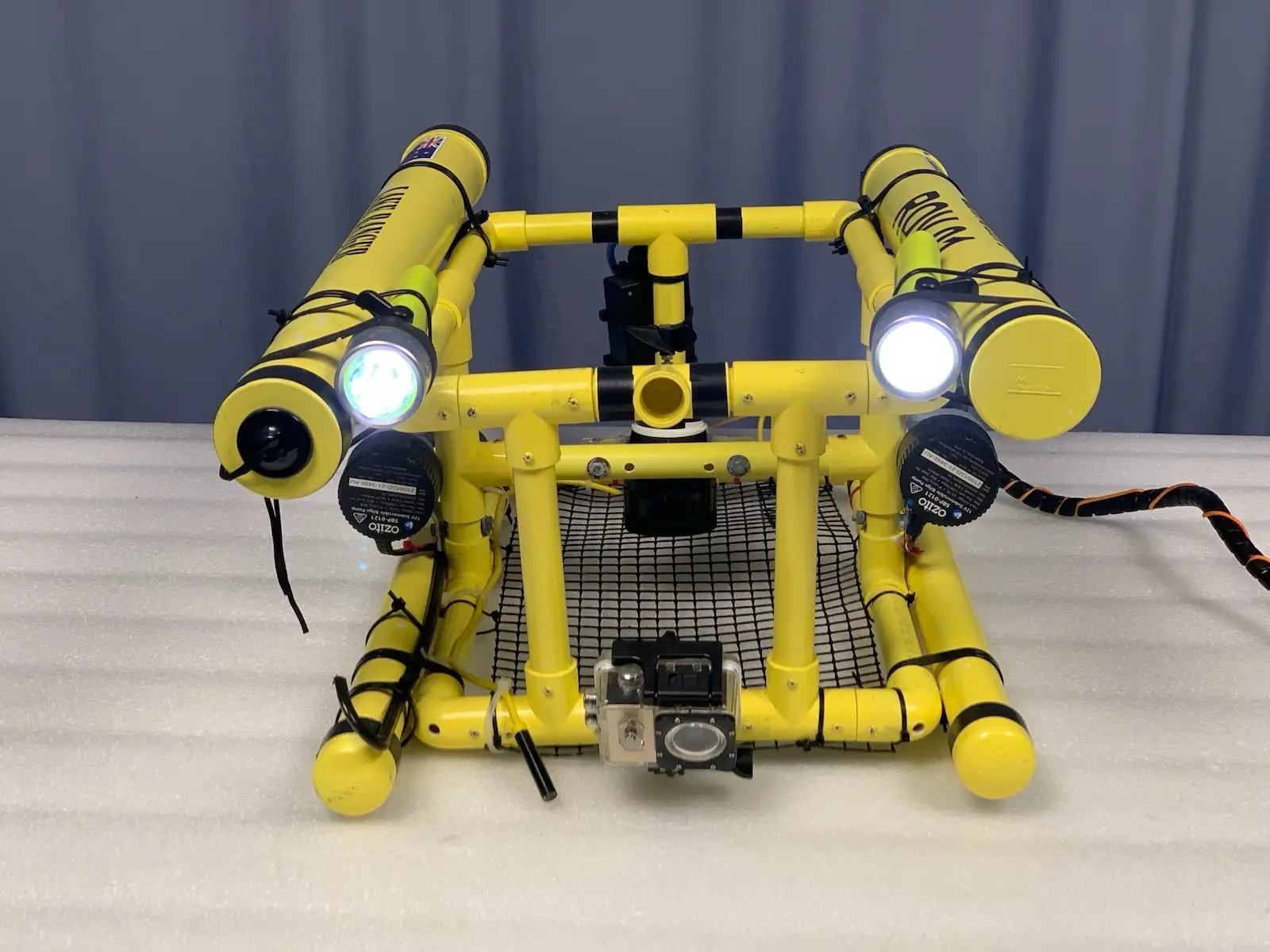 Propulsion: Powered by three 12V Ozito submersible thrusters (1700L/H each) for reliable movement and depth control.